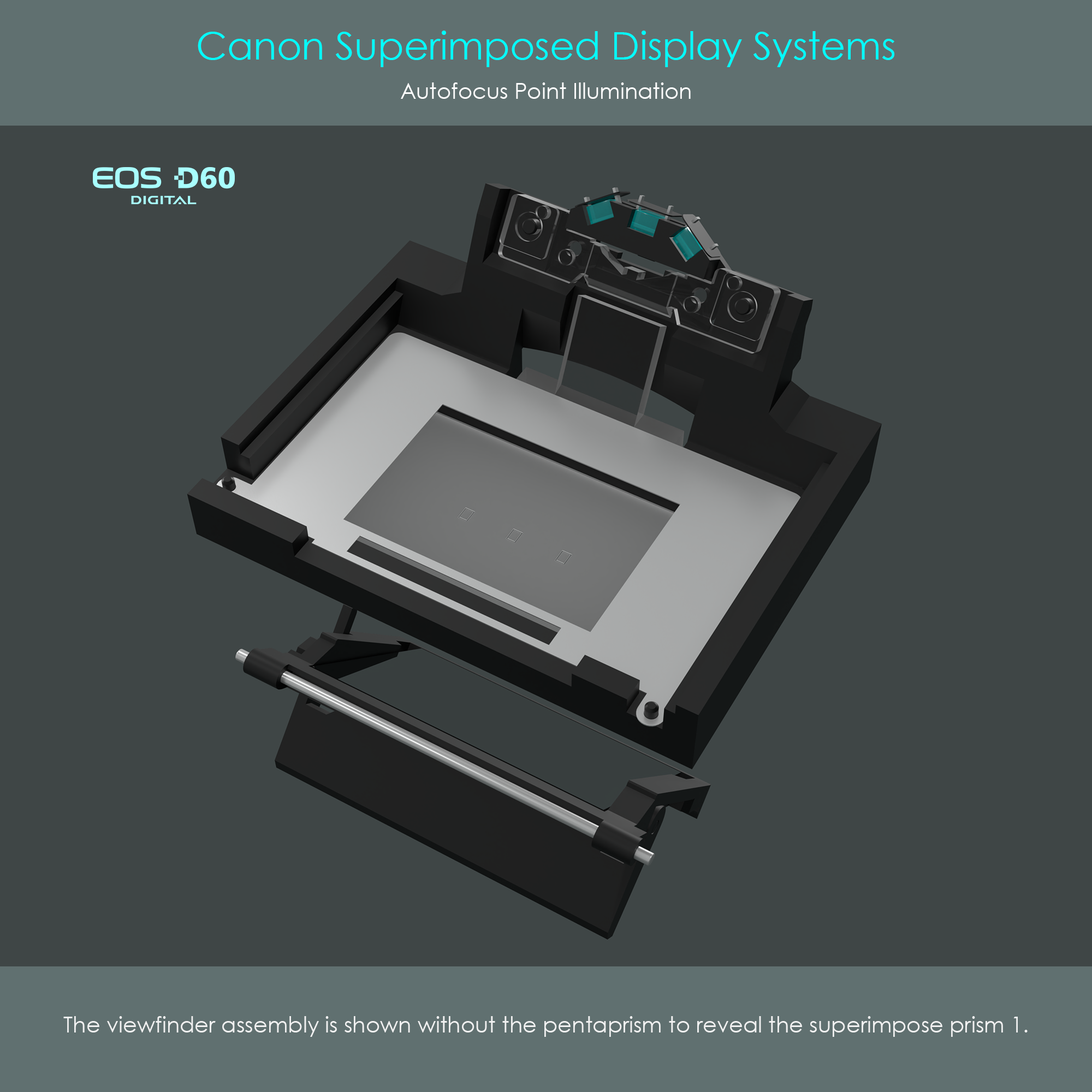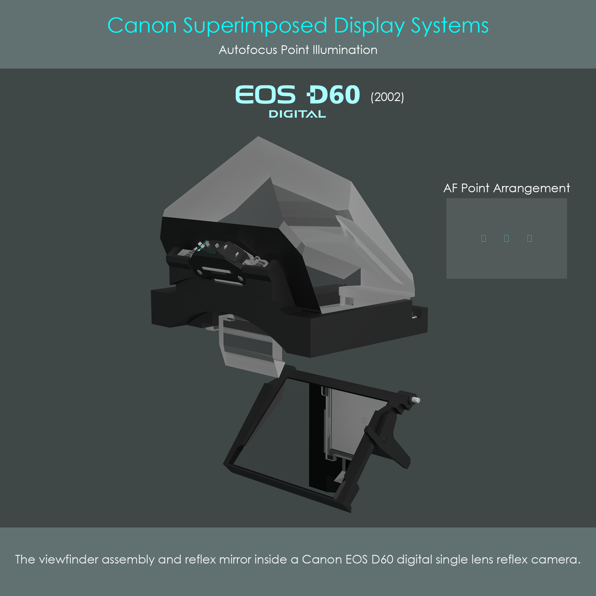 The Canon EOS D60 is an early APS-C format DSLR camera that was released in March 2002. The camera's viewfinder is equipped with three AF frames arranged in a horizontal line, and each of them can be lit up individually. The camera's AF point illumination system uses LEDs located behind the pentaprism to shoot beams of light into the direction of the reflex mirror. Light reflects off the reflex mirror and is directed towards the individual AF frames engraved into the focusing screen.