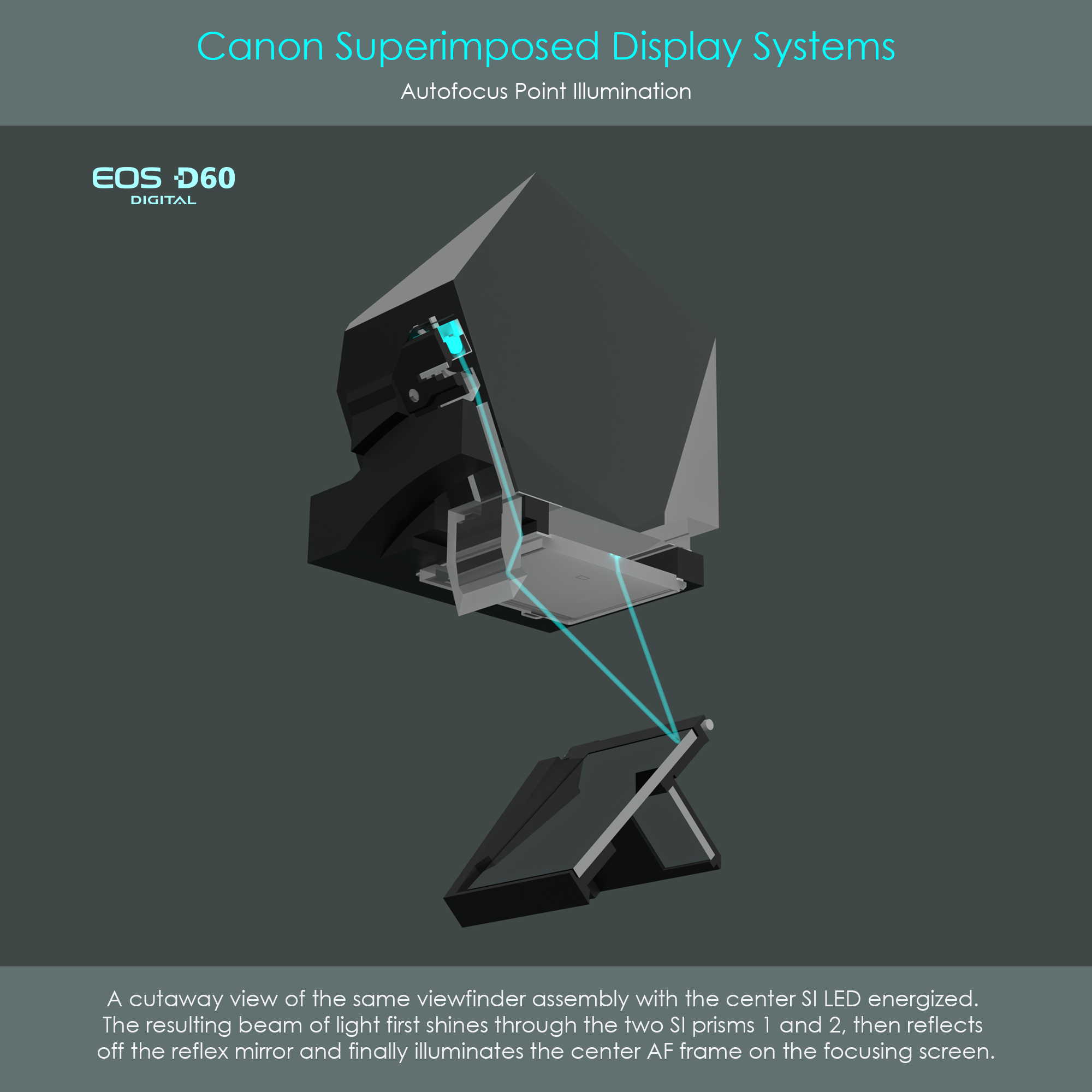 The superimpose LEDs are positioned inside a support structure so that their light is passed into SI prism 1 from which light is then passed into SI prism 2. The SI prisms are designed so that internal reflections may occur but light can enter and leave at certain surfaces. While using the viewfinder, the reflex mirror is in its lower position so light from the SI prism 2 can reflect off into the direction of the focusing screen. The light is a visible flash on the AF frame so it can clearly be seen even if there is a bright preview image on the focusing screen. Light from the focusing screen and the AF frames is then passed through the pentaprism (where it is also flipped into the correct orientation) towards the eyepiece.