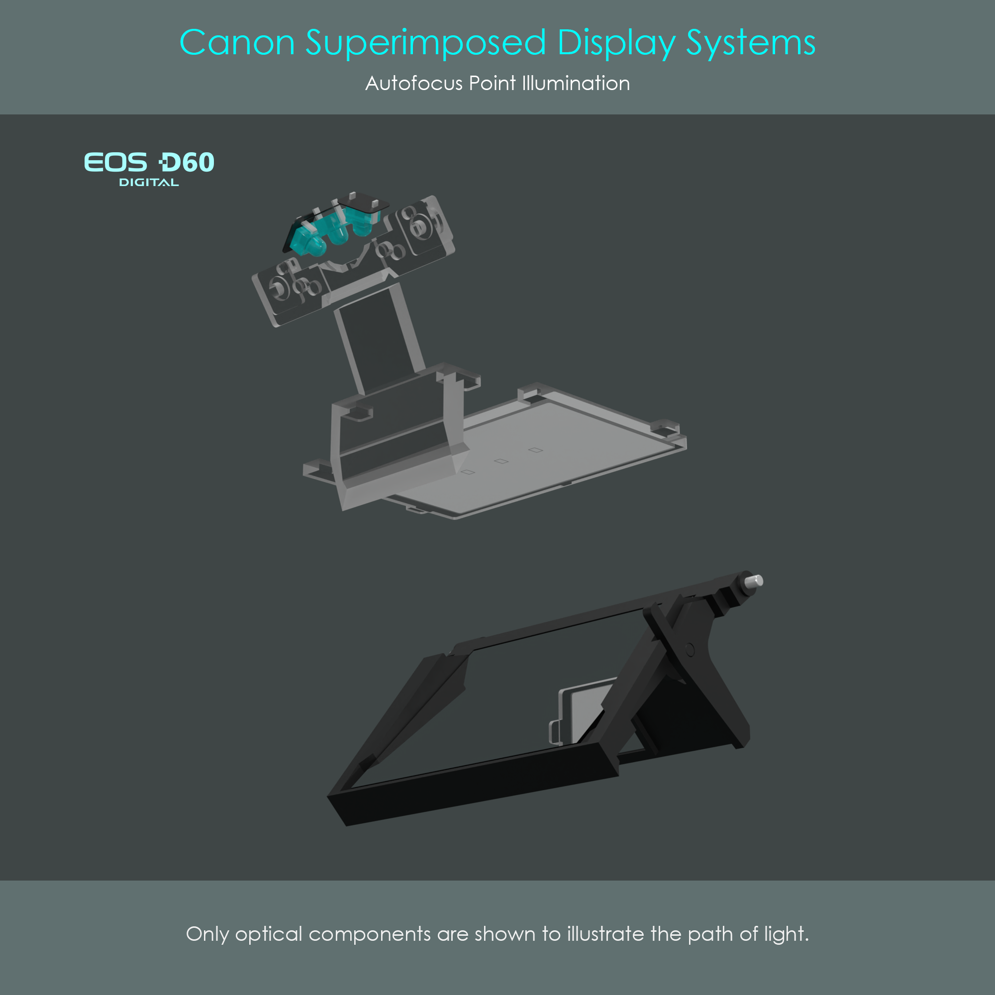 Here is the same perspective of the viewfinder as seen before but only optical components are shown. This clarifies which parts are actually involved in the AF point illumination. The animation toggles through all the AF frames.