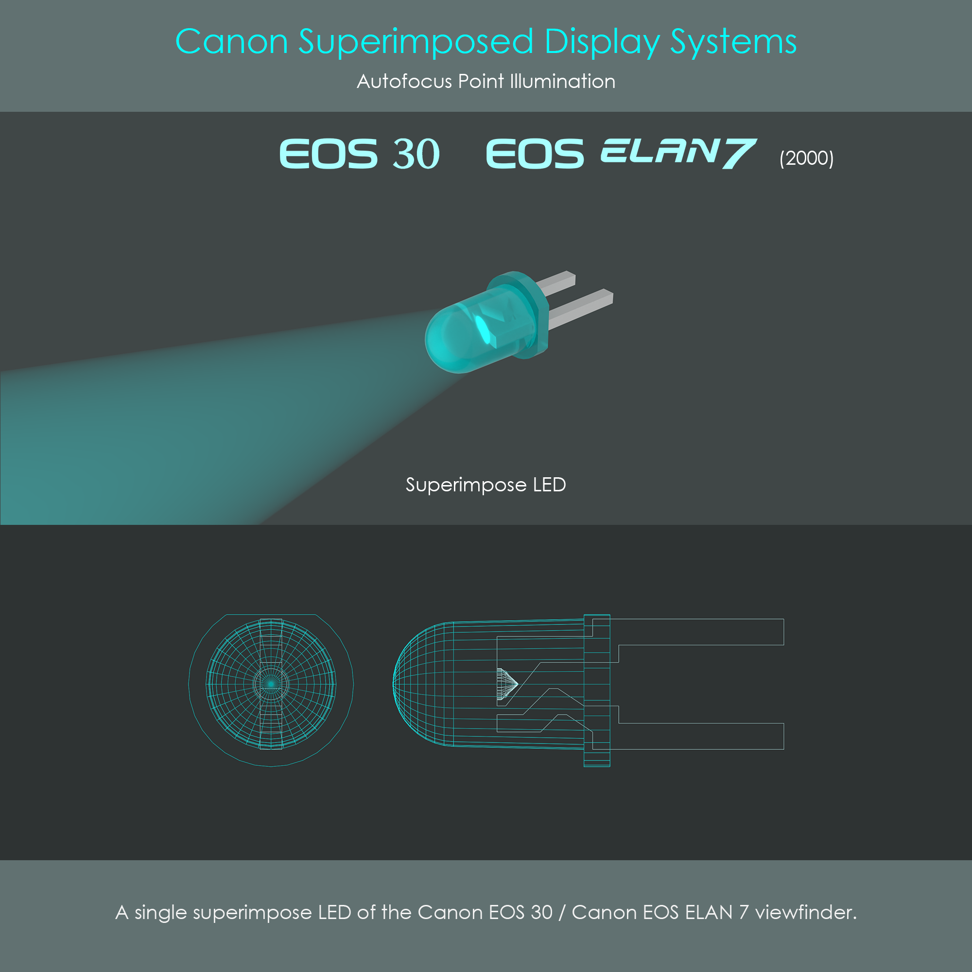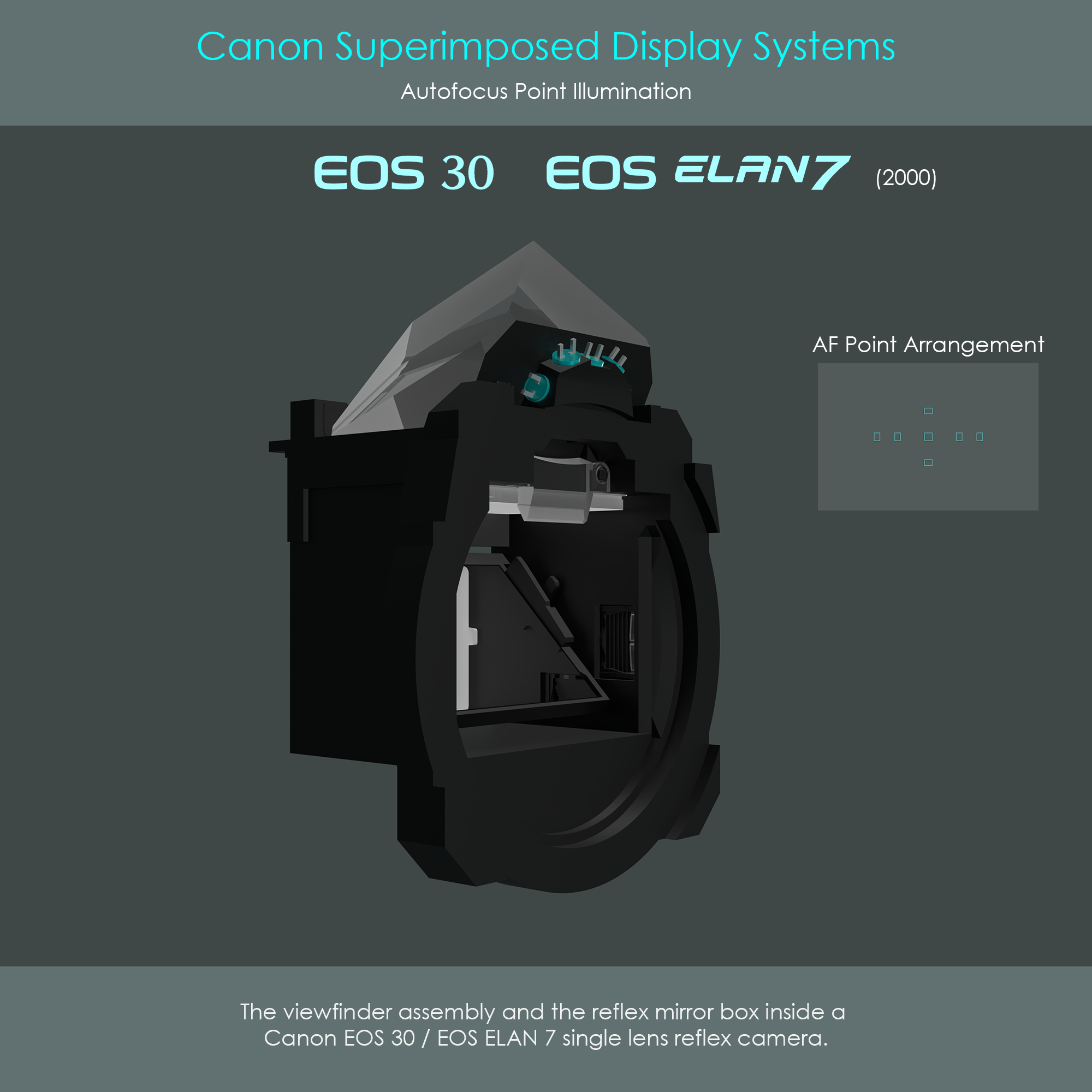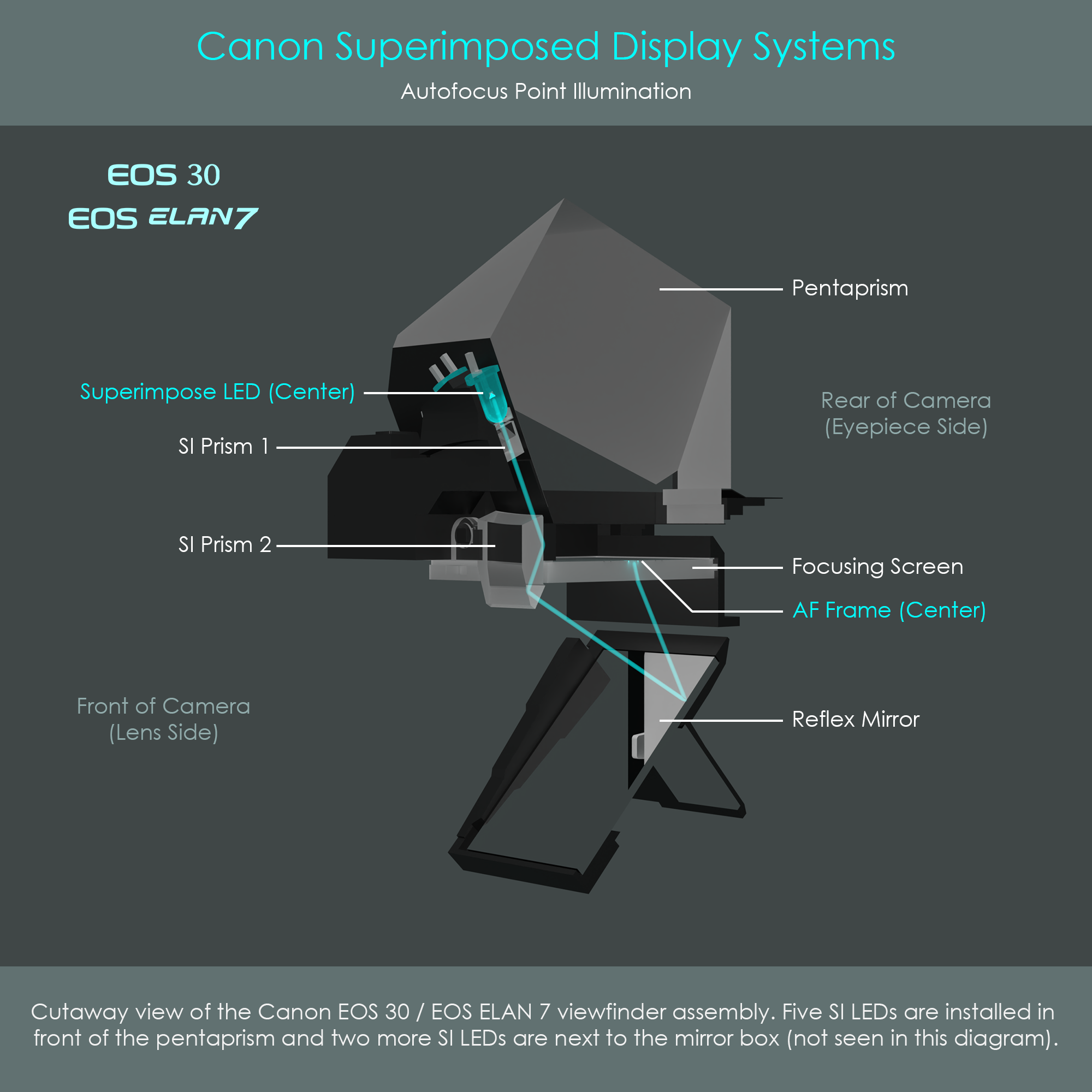 The Canon EOS 30 (called EOS 7 in Japan, and EOS ELAN 7 in North America) is a 35mm film SLR camera that was released in 2000. The camera's viewfinder is equipped with seven AF frames arranged in a cross configuration, and each of them can be lit up individually. The camera's AF point illumination system uses five LEDs located behind the pentaprism and two LEDs next to the mirror box to shoot beams of light into the direction of the reflex mirror. Light then reflects off the reflex mirror and is directed towards the individual AF frames engraved into the focusing screen. A unique detail of the EOS 30 is that it uses three SI prisms to redirect light from the SI LEDs towards the reflex mirror.