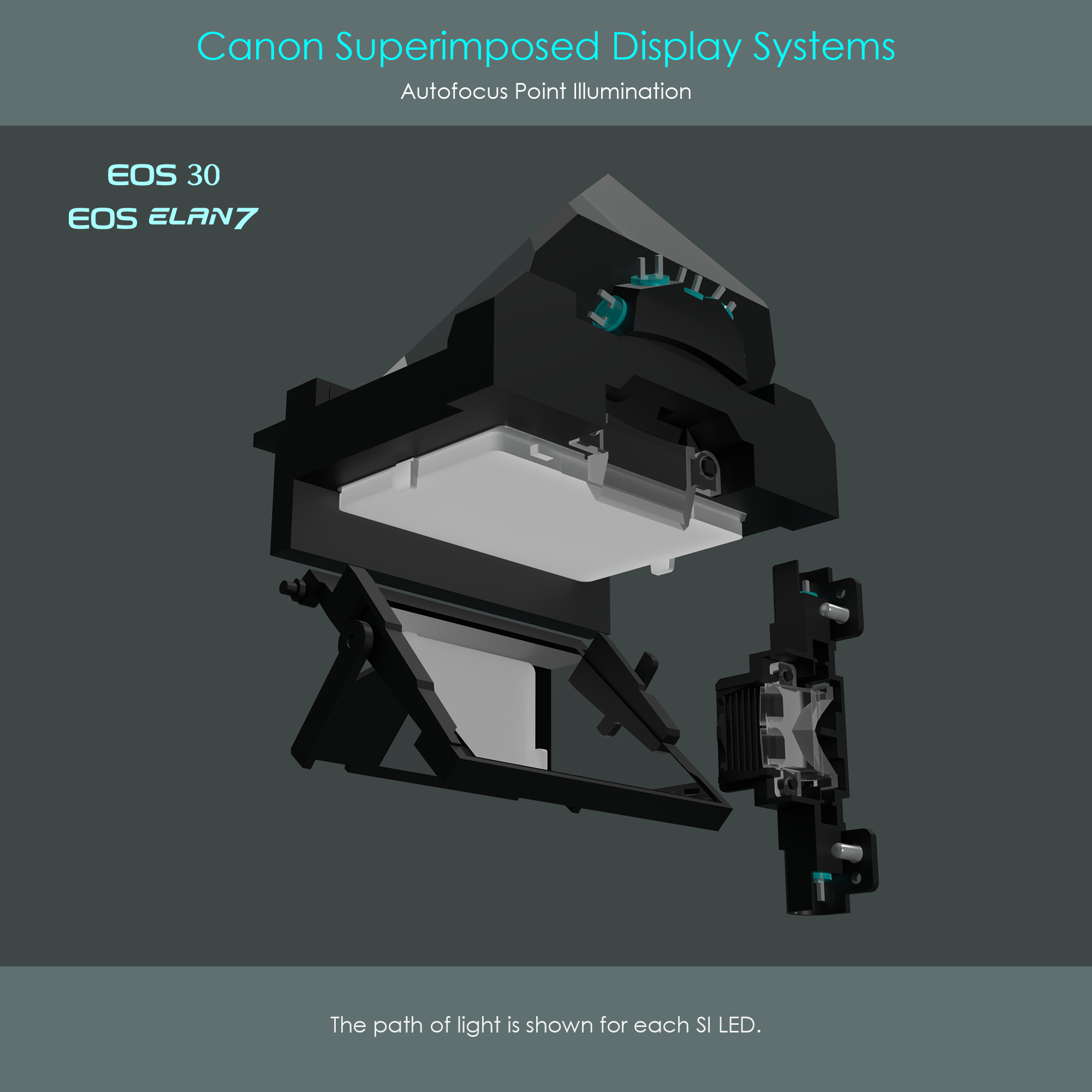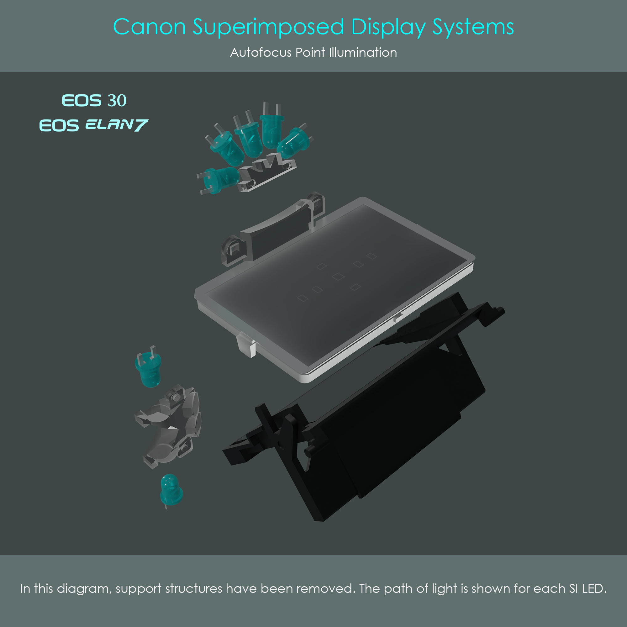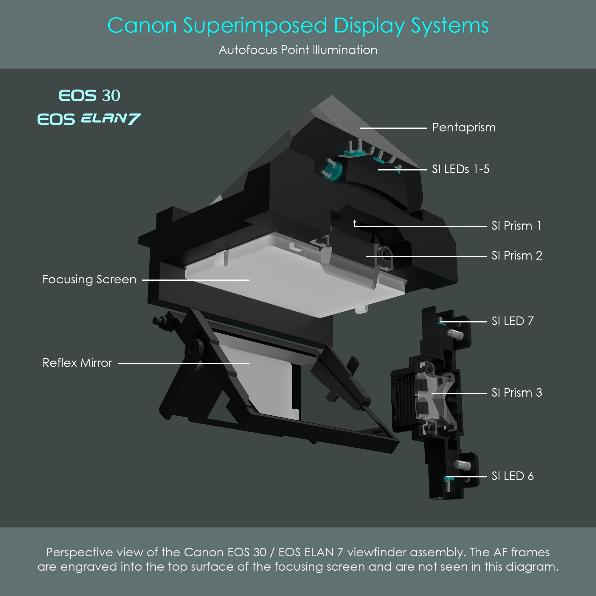 The following illustration is a cutaway diagram of the Canon EOS 30 viewfinder unit. The upper five superimpose LEDs are positioned inside a support structure which is part of the pentaprism seat. Light from these five LEDs passes through SI prisms 1 and 2 before hitting the reflex mirror, and finally lighting up the AF frames on the focusing screen.