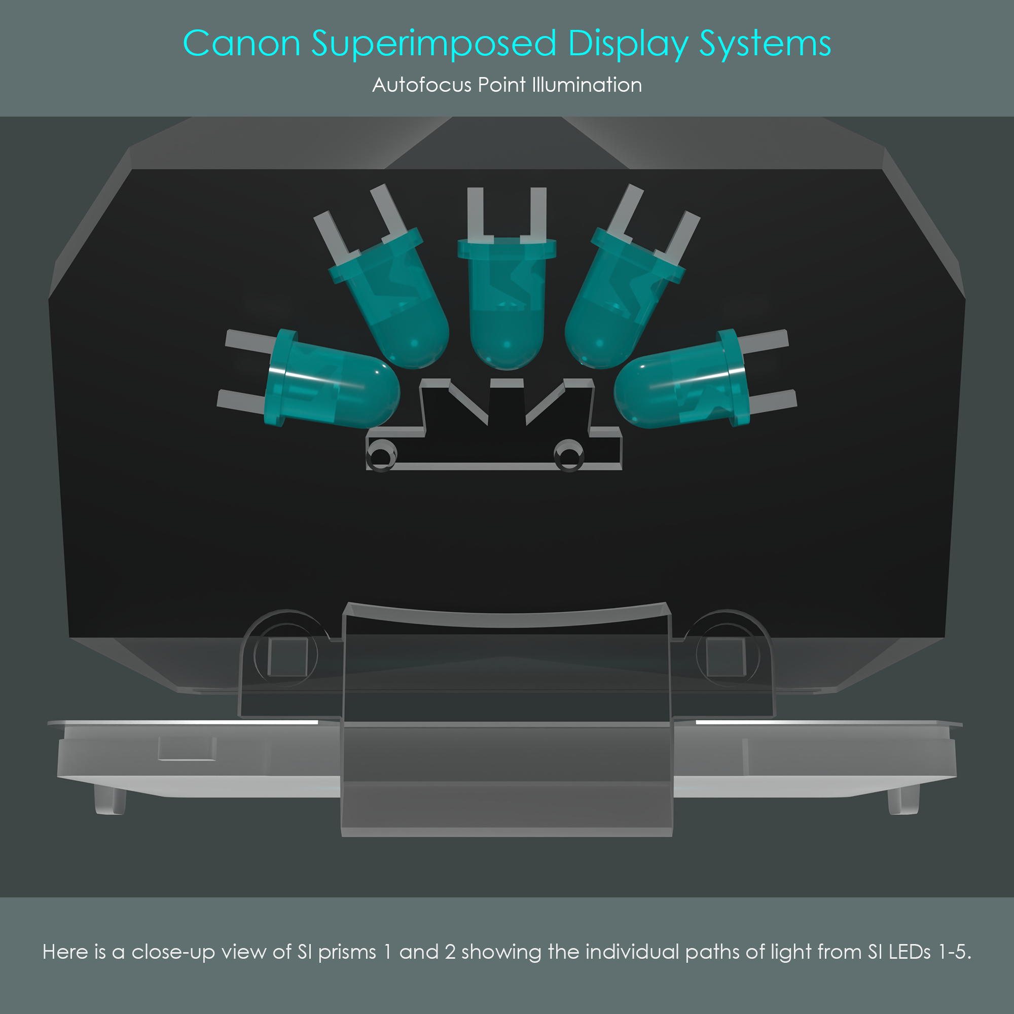 Only optical components are shown but from a top perspective. The animation toggles through all the AF frames. This view clarifies how the upper SI LEDs 1-5 illuminate the AF frames that are arranged in a horizontal line while the side LEDs 6-7 illuminate the upper and lower AF frames of the cross configuration. Once an AF frame lights up in red, it can be seen very clearly through the eyepiece.