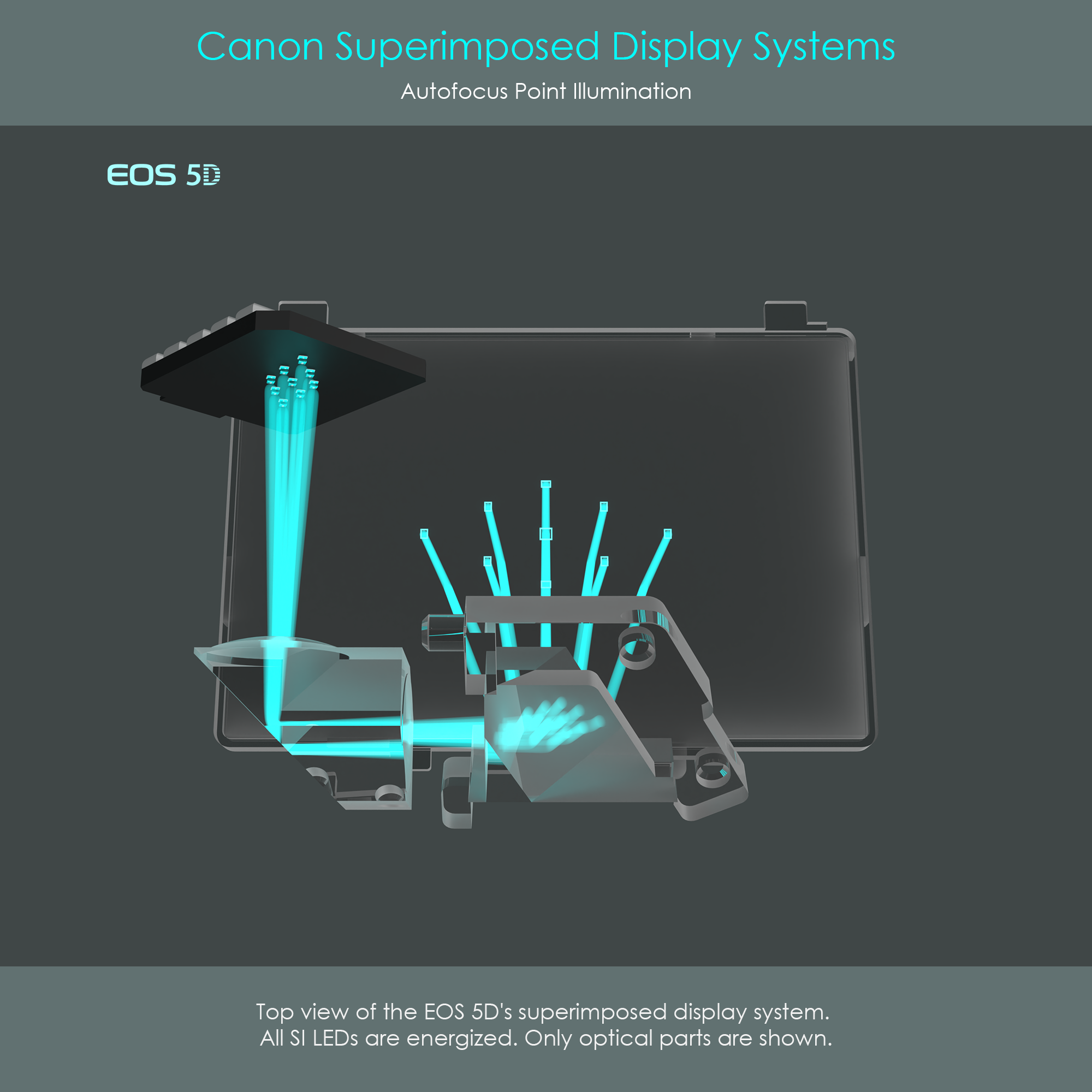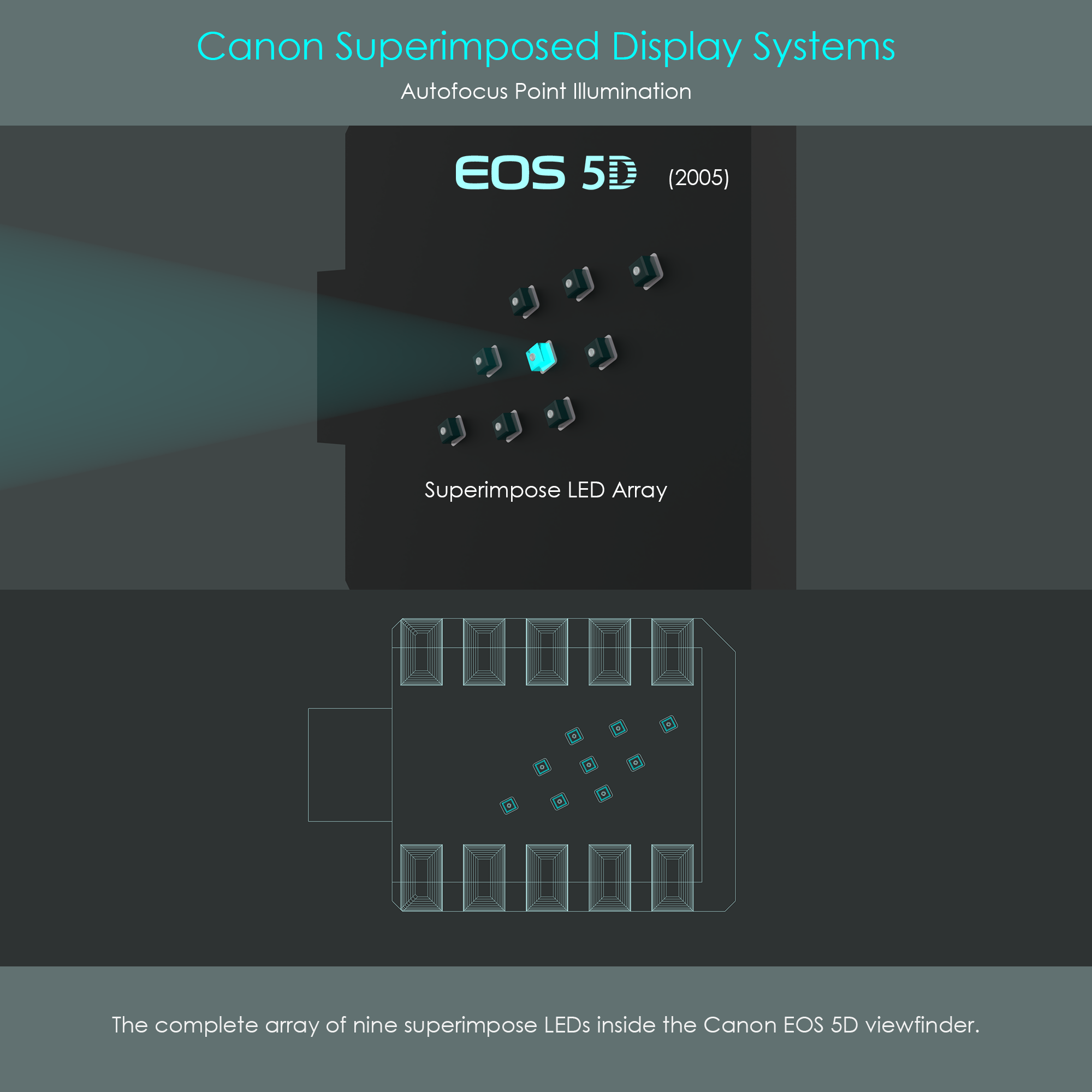 The Canon EOS 5D uses an innovative array of nine chip-on-board micro LEDs. The actual electroluminescent semiconductor material is bonded directly onto a shared substrate. These red light-emitting diodes are absolutely microscopic in size: They have a square footprint with a side length of 0.25 mm. Nine of these micro LEDs are arranged on the substrate in an identical diamond configuration as the AF frames in the viewfinder. Tiny bond wires are connecting each LED's top contact to the board (not seen in this diagram). The substrate has wire traces integrated to ensure independent addressability of each micro LED (via common anode). This light unit is connected to the camera's viewfinder electronics via a 10-line flexible PCB.