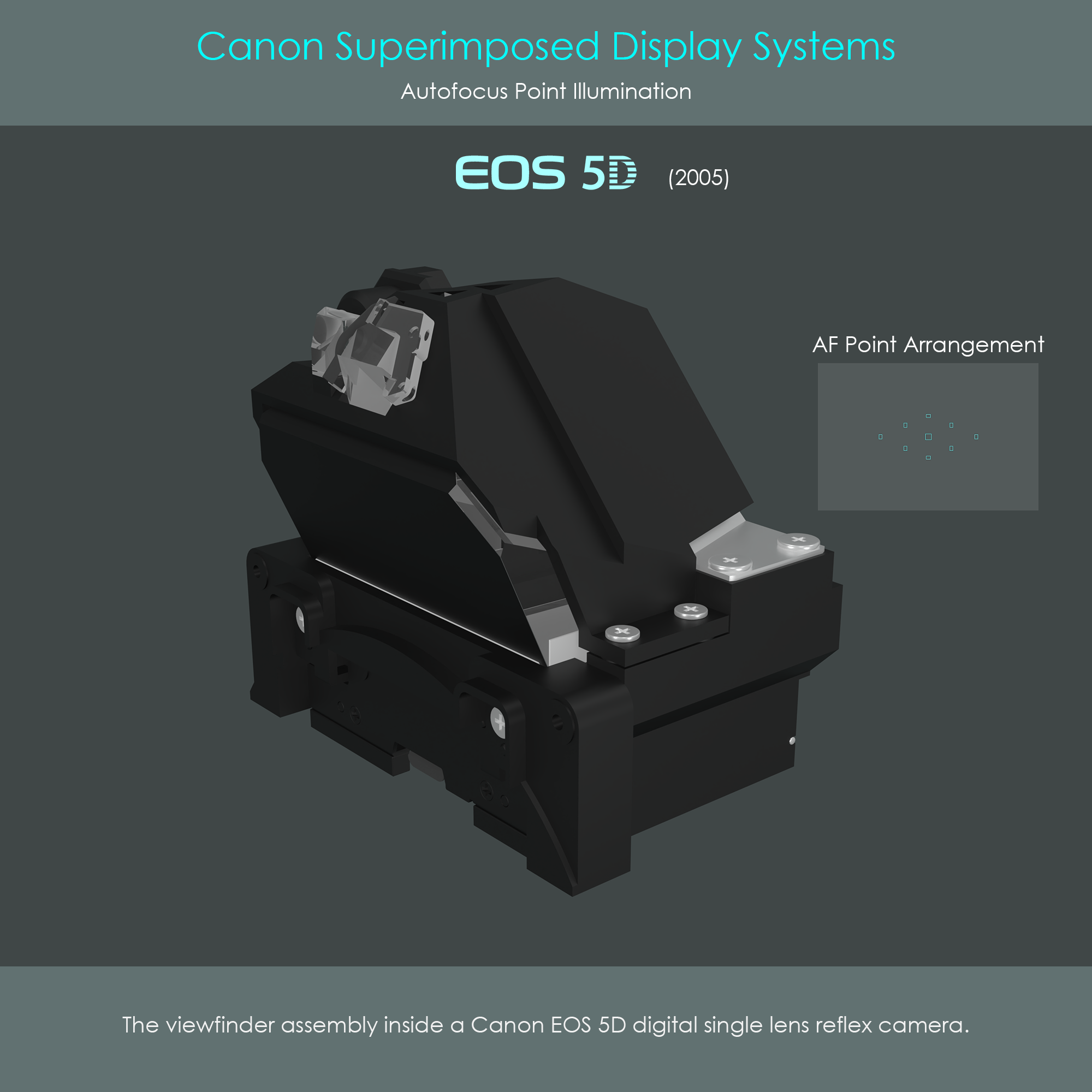 The Canon EOS 5D is a full-frame DSLR camera that was released in 2005. The camera's viewfinder is equipped with nine AF frames arranged in a diamond pattern, and each of them can be lit up individually. The camera's AF point illumination system uses an array of nine LEDs positioned on the upper rear of the pentaprism to shoot beams of light through two SI prisms and through the pentaprism itself. Light is projected in the configuration of the AF points on the reflective surface of the SI screen between the pentaprism and the focusing screen.