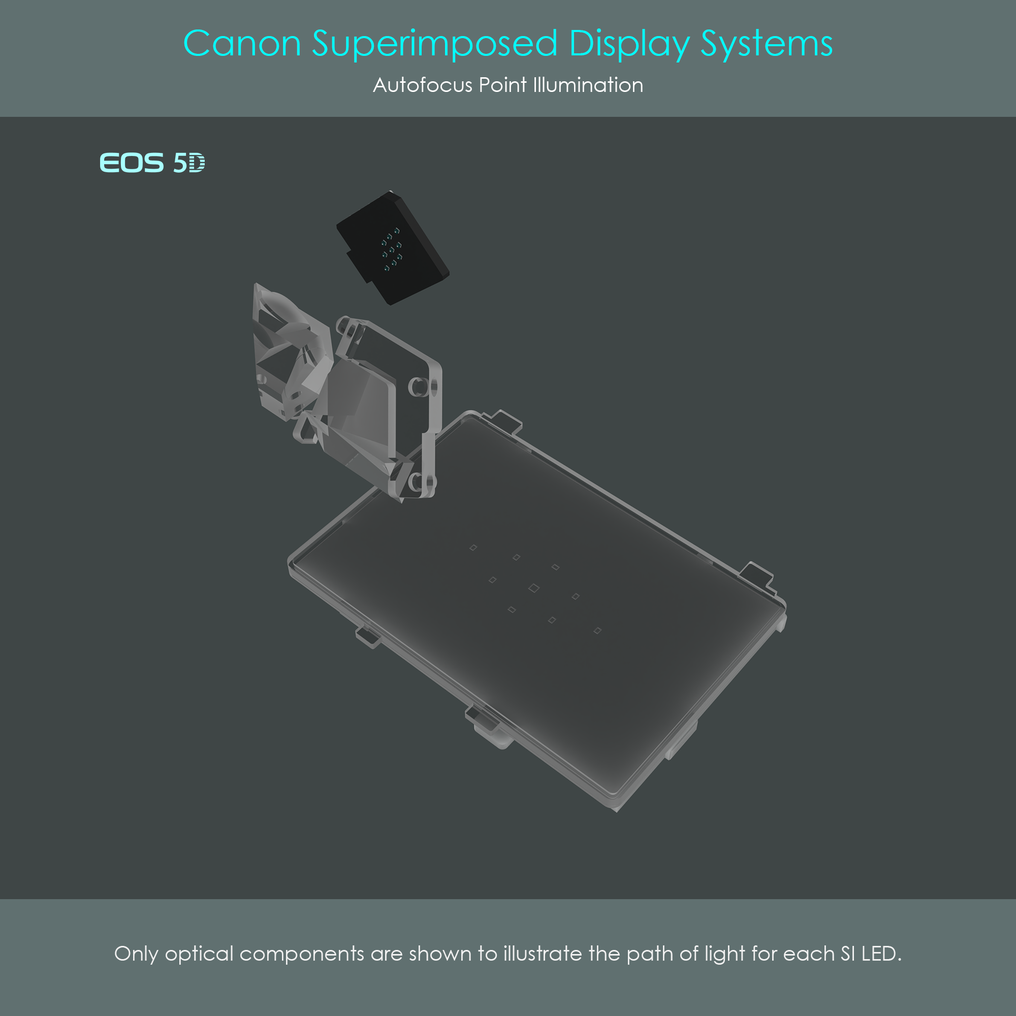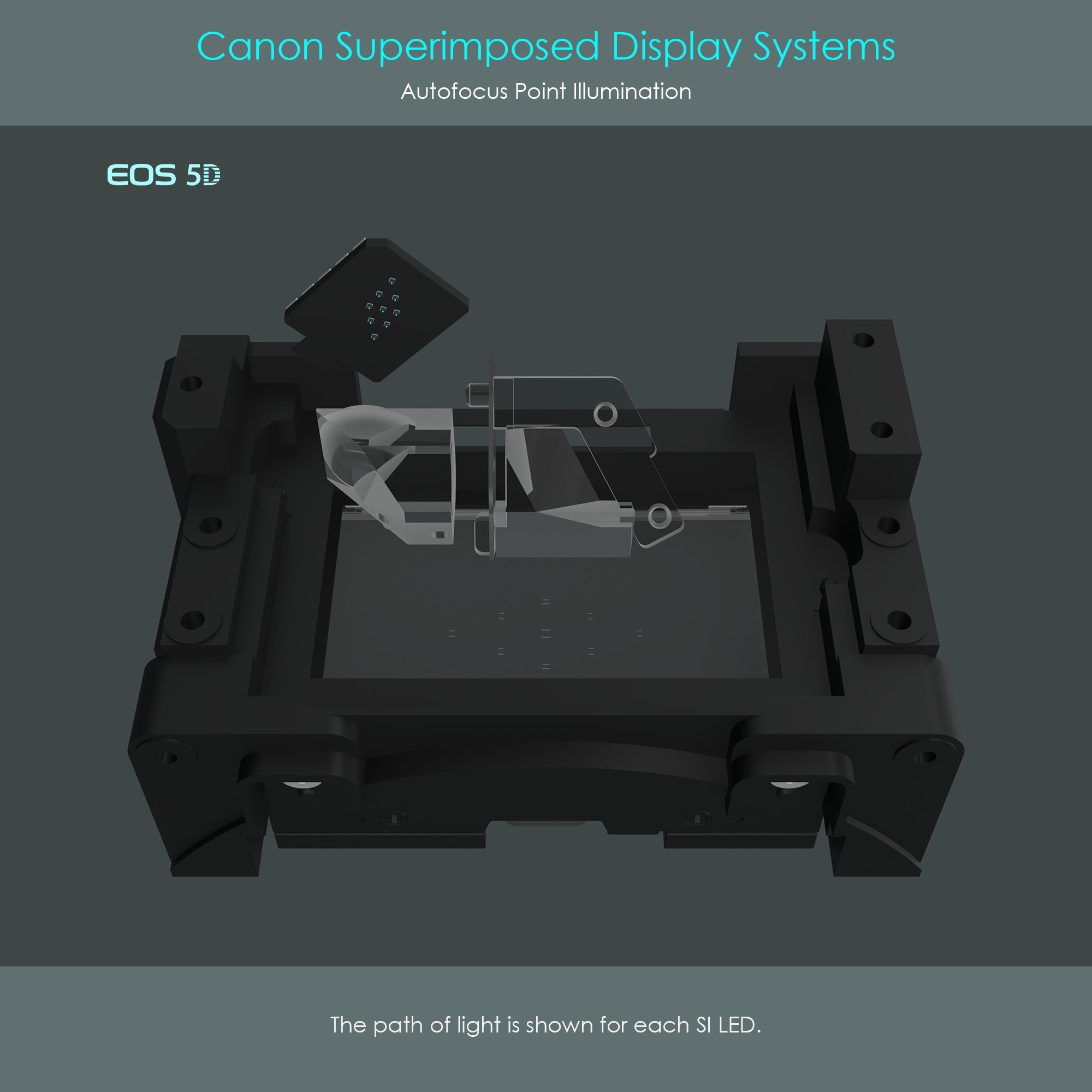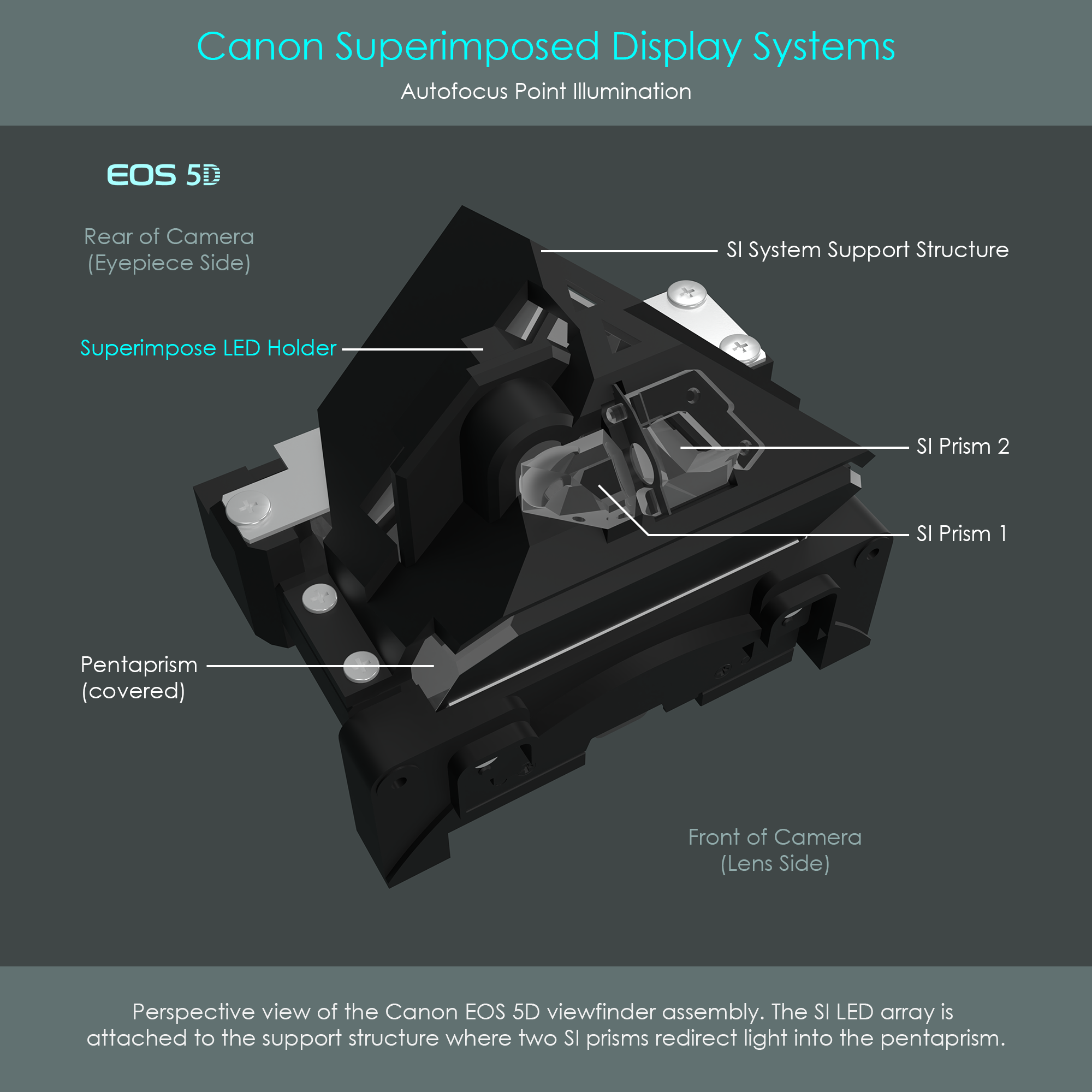 The SI LED array as well as the SI prisms 1 and 2 of the EOS 5D's SI display system are attached to a support structure. The support structure is designed to perfectly sit on top of the pentaprism and is screwed to the pentaprism socket.