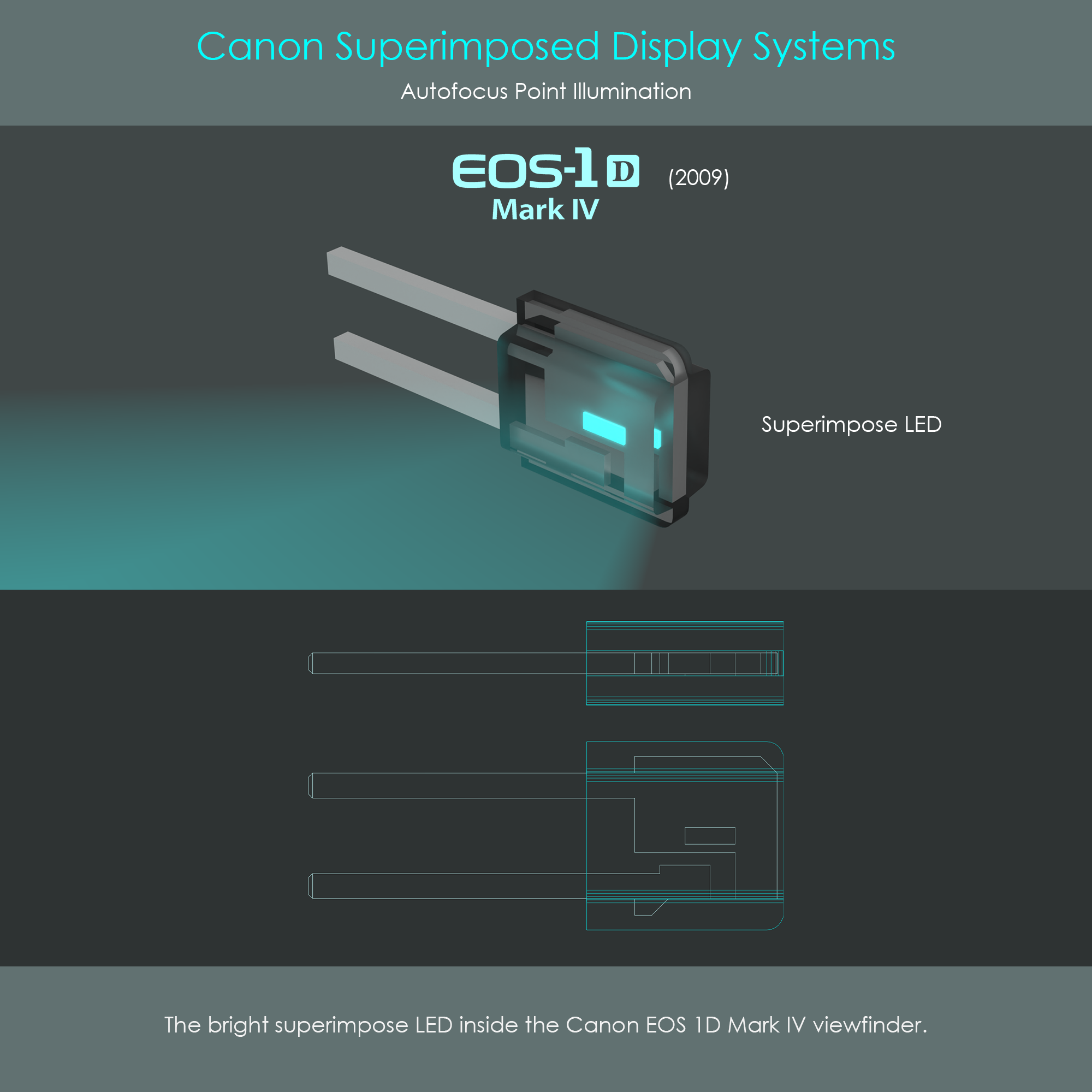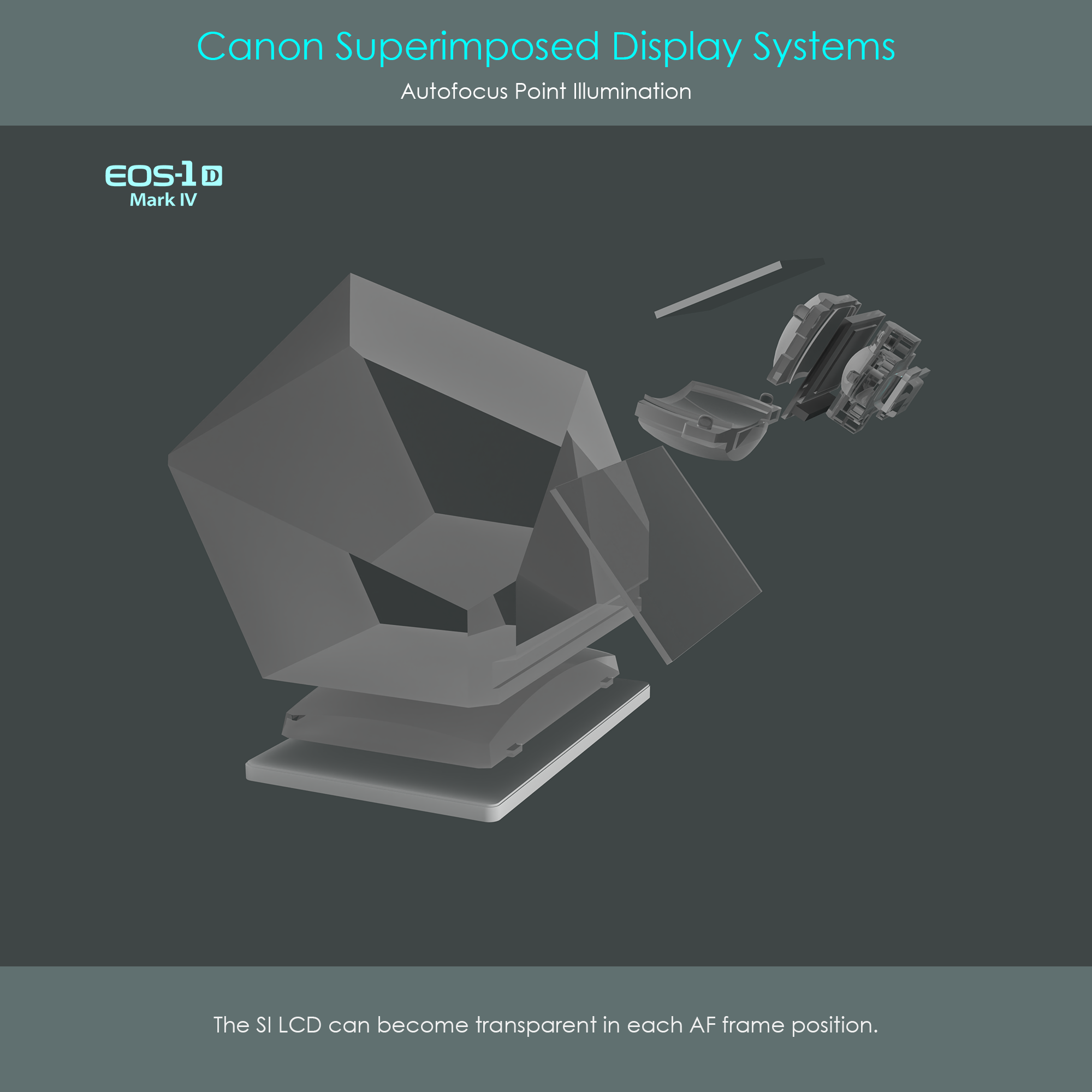 The following illustration is an exploded view of the EOS 1D Mark IV viewfinder unit including the superimpose display projection system.
