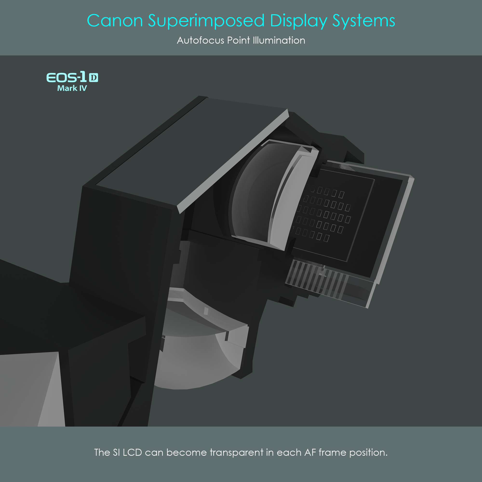 Here is a view of the superimpose display system as seen through the camera's eyepiece. All AF frames are transparent and the SI LED flashes in the animation.