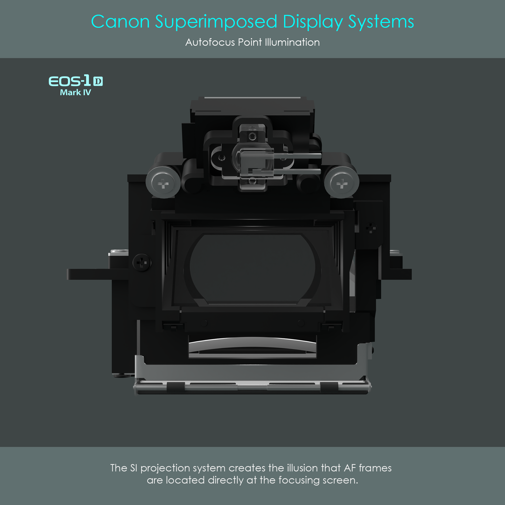 The projection system consists of various precisely arranged optical elements. Light from this projection system does not travel through the pentaprism or towards the focusing screen. Instead, the SI display system projects the AF frames into the user's field of view. The SI dichroic mirror is installed at an angle so that light that originates from the SI projection unit is reflected towards the eyepiece. A special feature of the SI dichroic mirror is that it is highly transparent to light from the focusing screen and pentaprism, and highly reflective to light from the SI LED which emits a very narrow wavelength of red light. While the user can still see the preview image on the focusing screen in the usual way, the dichroic mirror creates the illusion of the AF frames being positioned at the focusing screen itself.